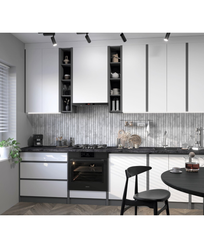 Нова лінійка в стилі Лофт з ЛДСП, відрізняється збільшеною висотою верхніх шаф (105 см) та глибиною нижніх (52 см). Модульна кухня з деревоподібним декором та корпусом антрацит. Матеріал корпусу і фасаду: ДСП.