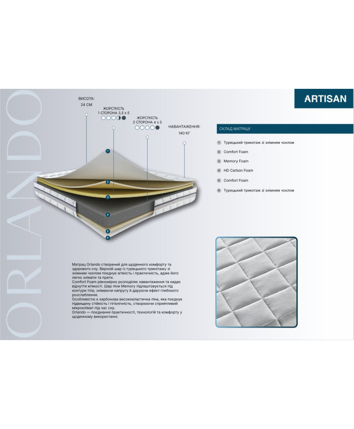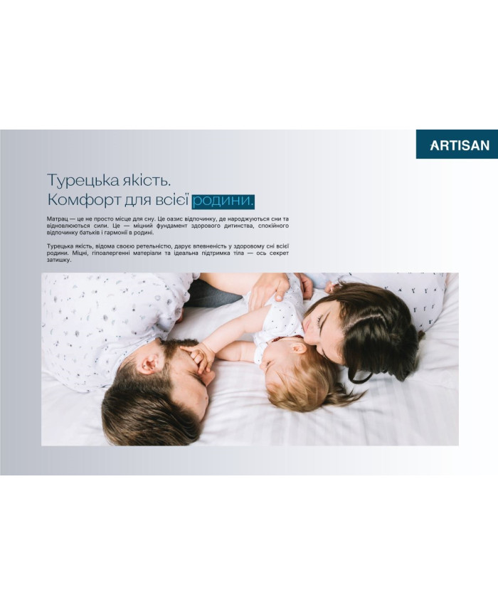 Унікальні складові, сучасні європейські технології та інноваційні матеріали матраців Artisan (Артизан) гарантують, що під час відпочинку та сну ви відчуєте розслаблення м'язів, правильну підтримку хребта, безпечні для алергіків.